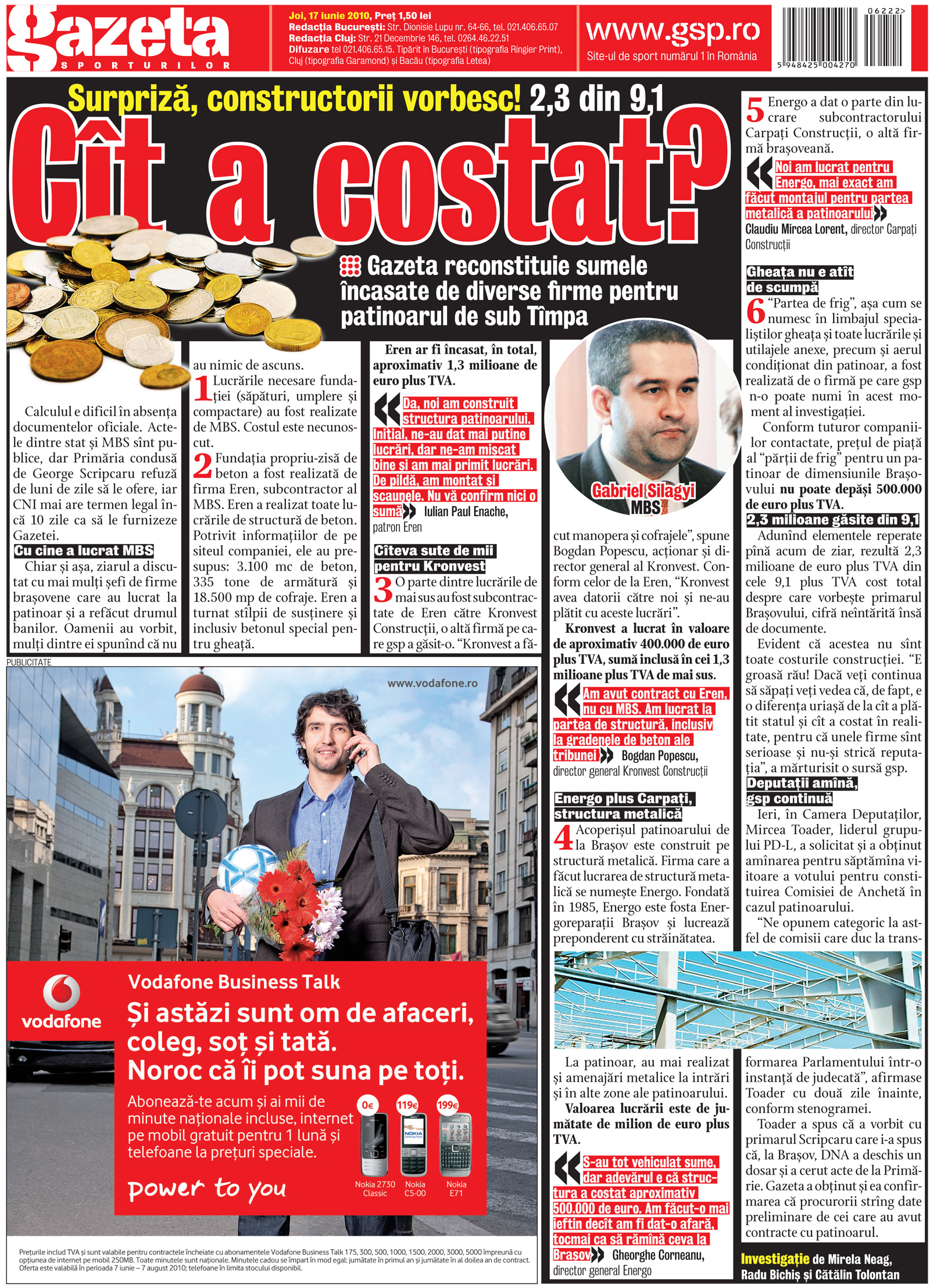 „Da, noi am construit structura patinoarului. Iniţial, ne-au dat mai puţine lucrări, dar ne-am mişcat bine şi am mai primit lucrări. De pildă, am montat şi scaunele. Nu vă confirm nici o sumă”