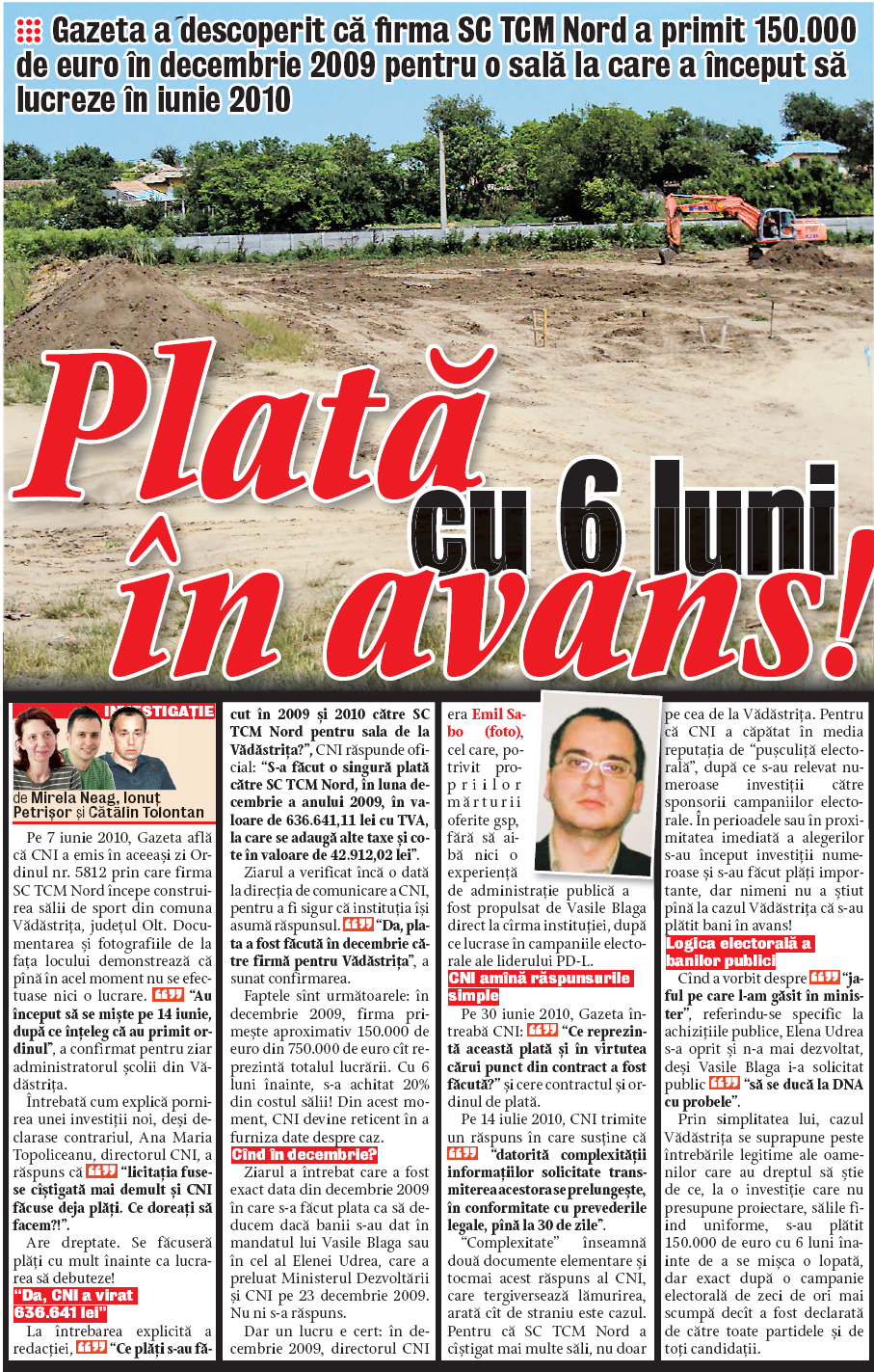Pe 7 iunie 2010, Gazeta află că CNI a emis în aceeaşi zi Ordinul nr. 5812 prin care firma SC TCM Nord începe construirea sălii de sport din comuna Vădăstriţa, judeţul Olt. Documentarea şi fotografiile de la faţa locului demonstrează că pînă în acel moment nu se efectuase nici o lucrare. „Am început să se mişte pe 14 iunie, după ce înţeleg că au primit ordinul”, a confirmat pentru ziar administratorul şcolii din Vădăstriţa.