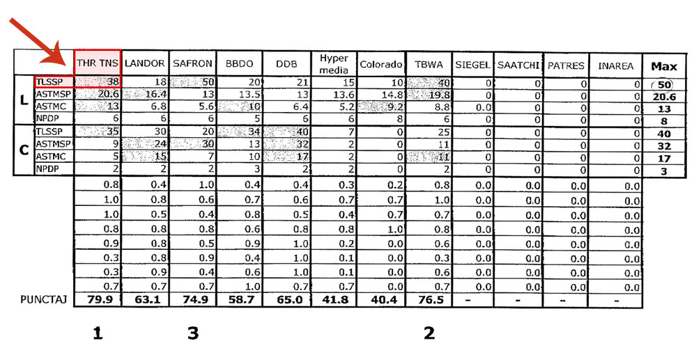 E o observatie jurnalistica si urmeaza o cifra. In plin proces al licitatiei pentru brandul turistic, participantii au intrat in posesia unui tabel centralizat din care rezulta ca experienta in branding a lui Eulogio Bordas, seful de proiect al THR, Asesores en Turismo, Hoteleria y Recreacion SA, este de 25 de ani. Mai apoi, cifra s-a rectificat si a ajuns la forma finala, pe care o vedeti aici si in urma careia spaniolii au cistigat cu cel mai mare punctaj. In dreptul THR figureaza 38 de ani de experienta in branding, istorie profesionala atribuita lui Eulogio Bordas si contributie numerica vitala pentru ca firma spaniola sa-si adjudece procesul.