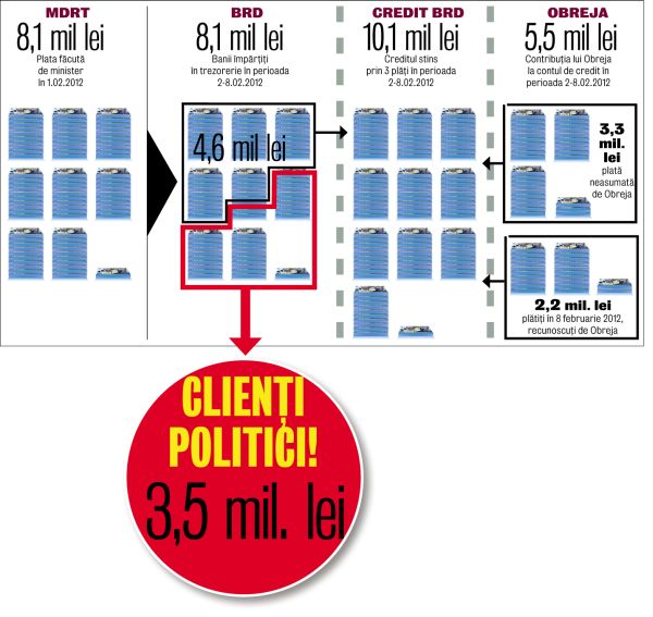 Pe 1 februarie 2012, MDRT varsă 8,1 milioane de lei din destinaţia bugetară a programului de bani europeni. Suma nu intră în contul de credit al lui Obreja ci, potrivit contractului de ipotecă, în contul de trezorerie, unde se derulează operaţiunile filialei Dorobanţi a BRD Societe Generale cu statul.