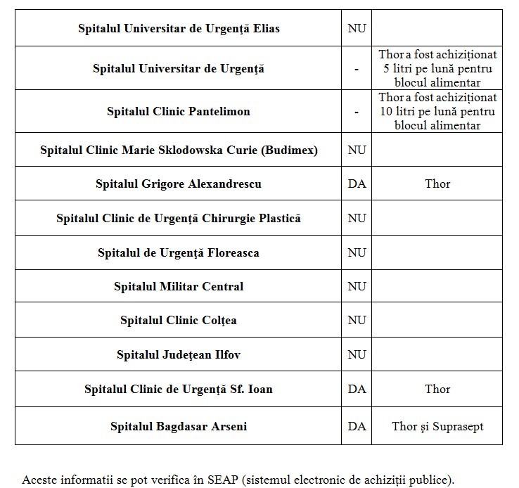 „Concentrația pentru Thor, Suprasept și alte dezinfectante pe care le livrăm spitalelor nu e în regulă. Uitați-vă la rețetele care ni se dau, vă rog! Nu se potrivesc rețetele cu etichetele! E un calcul simplu. Concentrația care reiese e mult prea mică față de ceea ce scrie pe etichete”, i-am zis eu, povestește sursa.