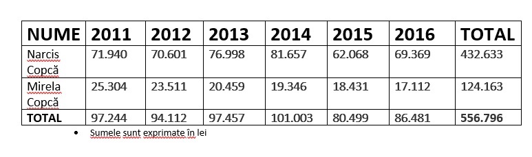 În privința veniturilor, luând la mână toate declarațiile de pe portalul Agenției Naționale de Integritate, din 2011 și până în 2016, Narcis Copcă declară câștiguri aproape neschimbate.