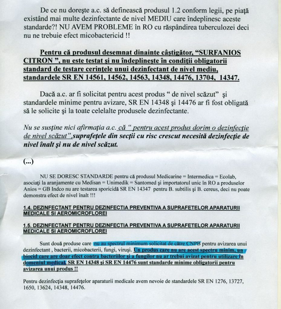 Fragment din raportul pe care colaboratorul SRI l-a înaintat în 2014 Serviciului, în care atrage atenția că biocidele nu respectă standardele și nu omoară toți germenii.